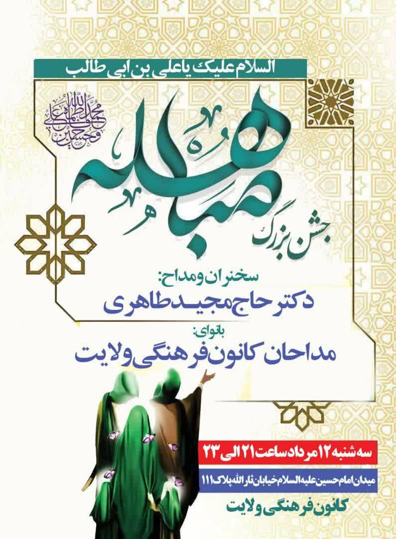 برنامۀ جشن مباهات حقانیت اهل بیت(علیهم السلام) در واقعۀ تاریخی مباهله در کانون فرهنگی آموزشی ولایت سخنرانی و مداحی دکتر حاج مجیدطاهری و مداحی مداحان کانون ولایت سه شنبه 12مرداد1400